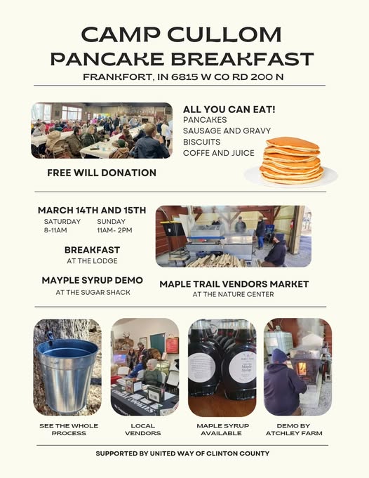 The Pancake Breakfast runs Saturday, March 14, from 8 to 11 a.m., and Sunday, March 15, from 11 a.m. to 2 p.m., at Camp Cullom, 6815 W County Road 200 North near Frankfort. Breakfast is all you can eat and includes pancakes, sausage and gravy, biscuits, coffee and juice for a free‑will offering. Guests can then walk over to the Sugar Shack and Nature Center area to see syrup being made and shop the Maple Trail Vendors Market.