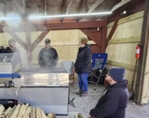 The sap itself is clear and only faintly sweet, “like sugar water,” with typical sugar content of just 1–2 percent. To turn that into syrup, the collected sap is boiled for hours at the sugar house to evaporate the water and concentrate the sugars. “A lot of times it’ll take 40 to 50 gallons of sap just to make one gallon of maple syrup,” Atchley said. That long, careful boil is why he calls real maple syrup a “delicate process,” noting that a few bad minutes at the pan can scorch a batch or ruin a night’s work.