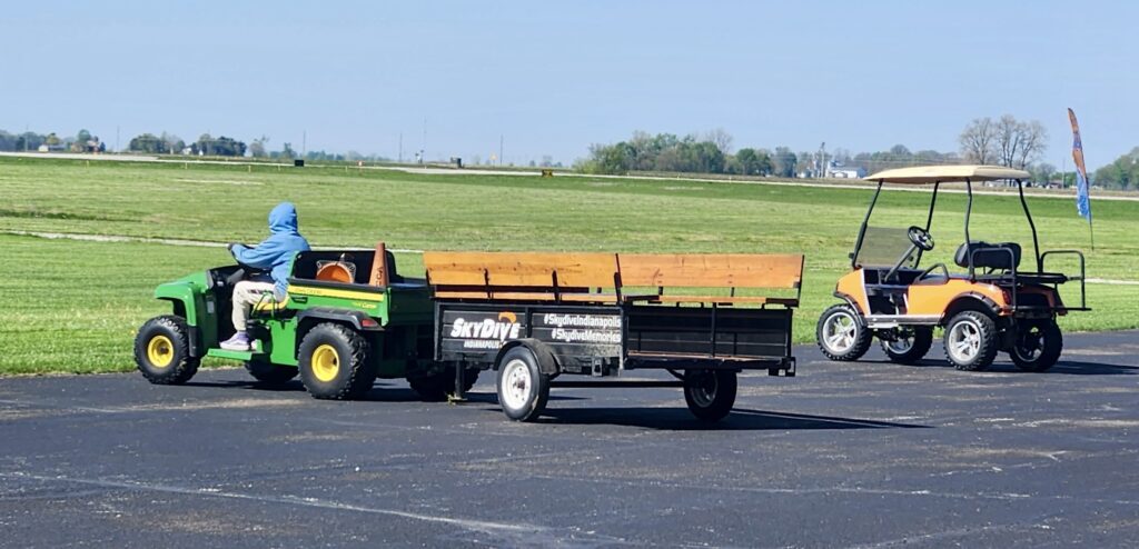 Multiple canopies could be seen in the air, with jumpers making their approach to the well-marked landing area as ground crew and spectators looked on. John Deere utility vehicles and branded golf carts moved across the ramp — a ground crew ready to support another busy day of operations.