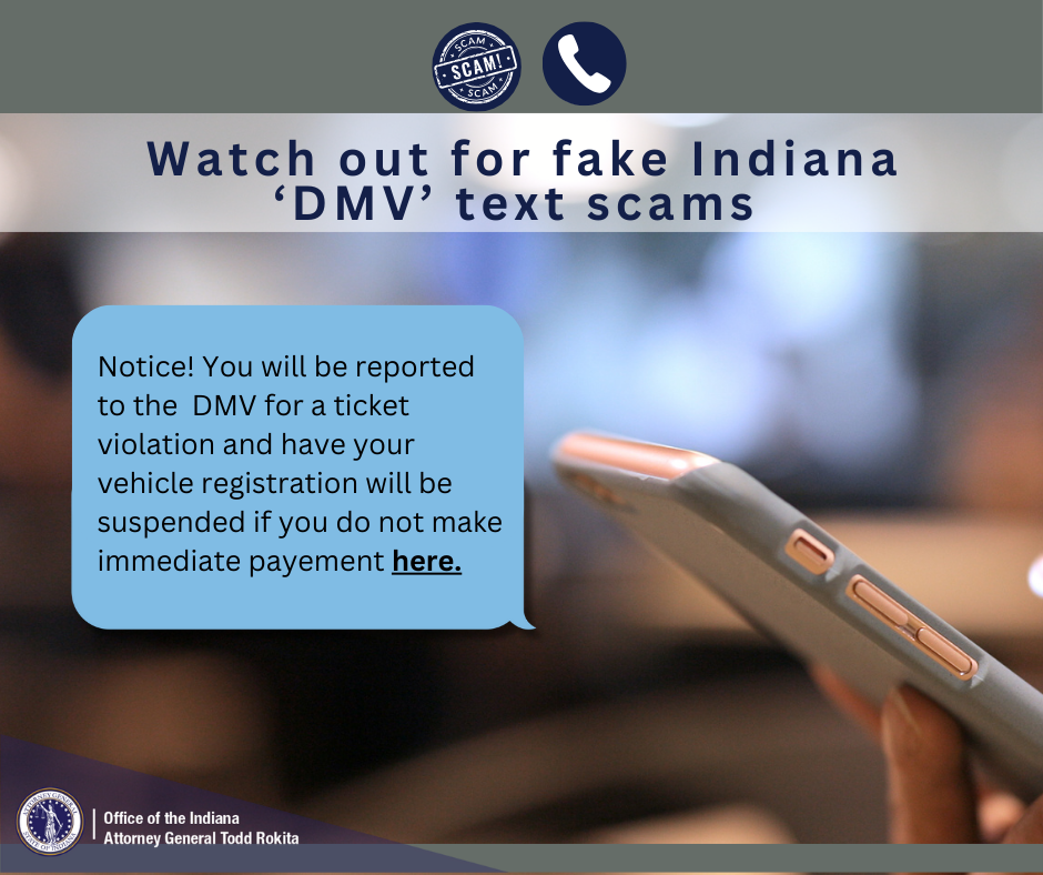 Attorney General Todd Rokita is alerting Hoosiers about a text message scam falsely claiming to be a “final notice” from the State of Indiana Department of Vehicles (DMV), not the Indiana Bureau of Motor Vehicles. These fraudulent messages aim to steal personal and financial information from unsuspecting individuals by threatening actions related to alleged traffic violations.