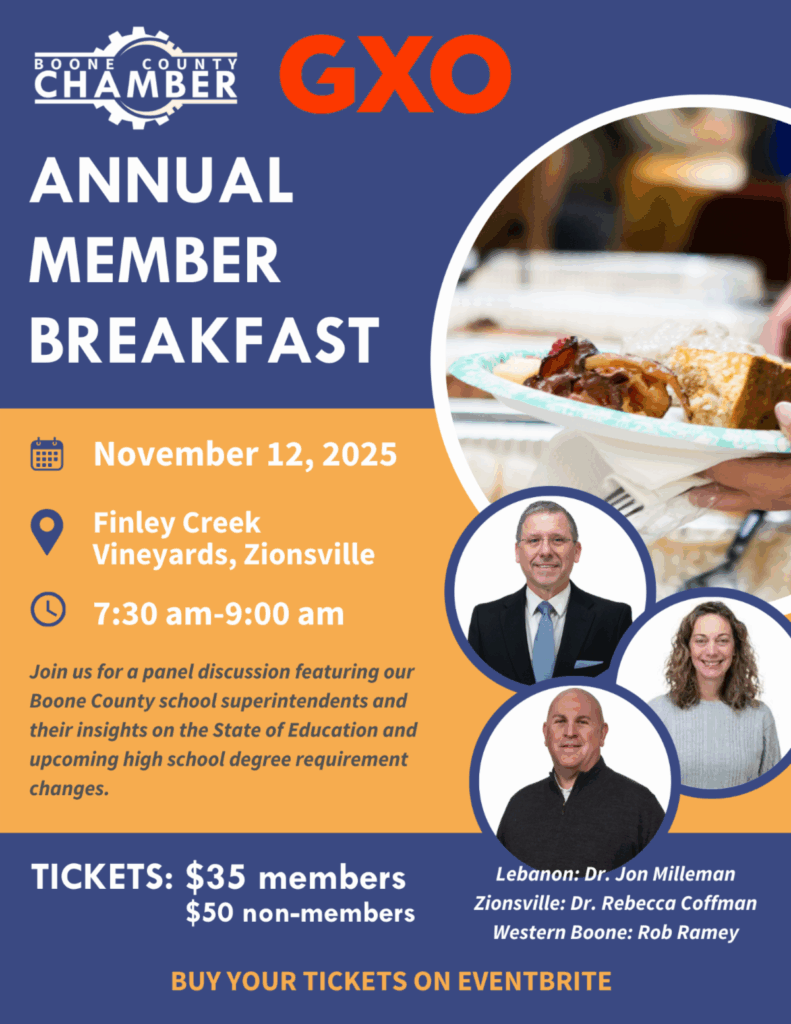This year’s Annual Member Breakfast, presented by GXO, promises to be an event full of connection and insight. Guests will enjoy a delicious breakfast provided by Jacquie’s Catering, while also hearing from a special discussion panel featuring Boone County school superintendents.