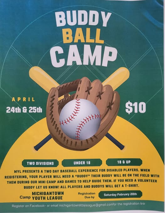 Registration for Buddy Ball Camp is due by Saturday, February 28. Those interested can register through Facebook or by emailing michigantownlittleleague@gmail.com to receive the registration link.