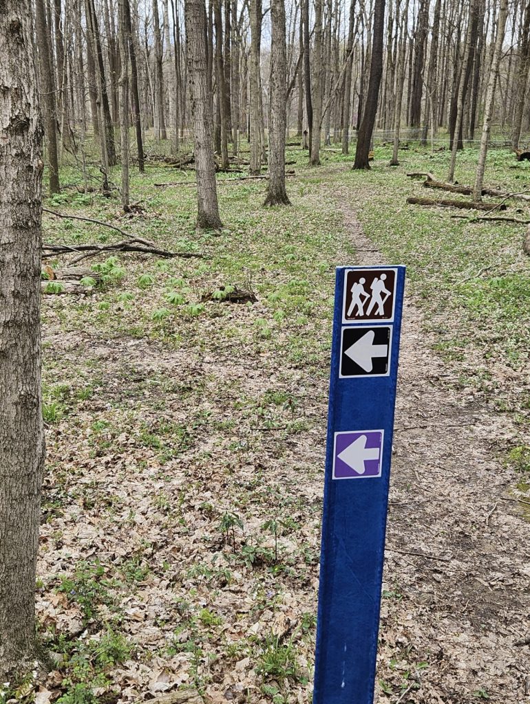 Marker for one of the several well marked hiking trails at Camp Cullom. These trails were constructed, marked and mapped as an Eagle Scout project by Owen McGill
