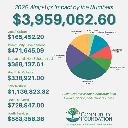 The Community Foundation Serving Howard, Clinton, and Carroll Counties is celebrating a year of significant impact, announcing that nearly $4 million was granted across the three counties in 2025, made possible through the generosity of donors.