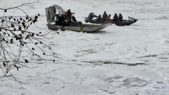 Under weather conditions of 12 degrees and snow, with that area of the river nearly frozen from bank to bank, officers deployed an airboat, reached the hunters, and brought them safely to shore.