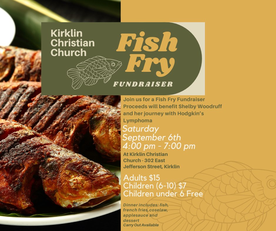 Kirklin Christian Church is hosting its Annual Fish Fry on September 6, 2025 from 4pm-7pm. The church is located at 302 E. Jefferson Street, Kirklin. The proceeds will benefit Shelby Woodruff and her journey with Hodgkin’s Lymphoma