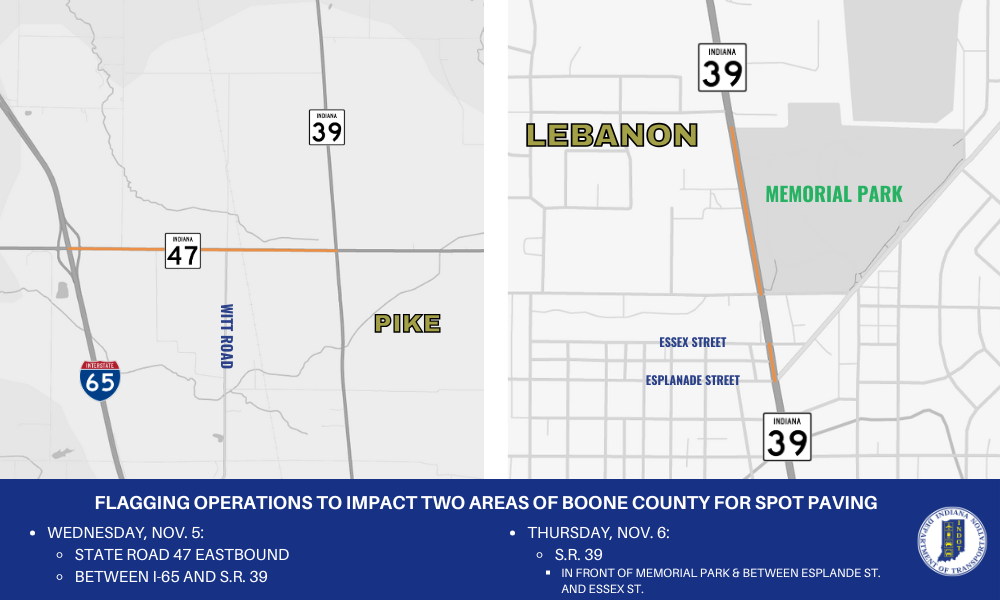 The Indiana Department of Transportation announces flagging operations that will impact State Road 47 and S.R. 39 in Boone County for spot paving.