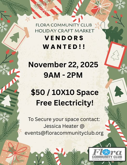 The Flora Community Club is calling on all local artisans, makers, and small business owners to take part in this year’s Flora Holiday Market, set for Saturday, November 22, 2025, in Flora, Indiana.