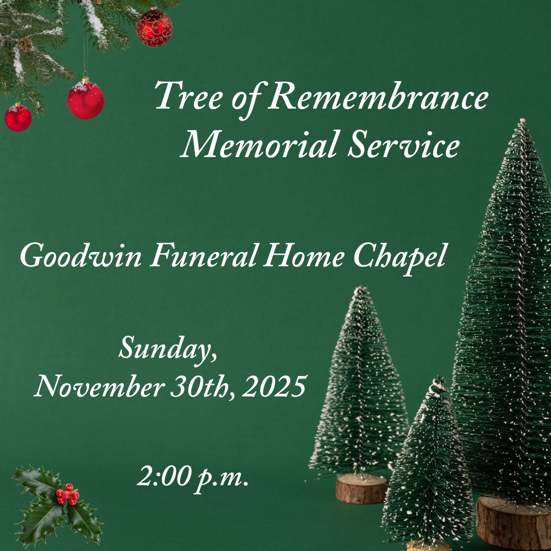 Goodwin Funeral Home invites the community to gather for a heartfelt tradition at the 31st Annual Tree of Remembrance Memorial Service. The event will take place on Sunday, November 30, 2025, at 2:00 p.m. in the Goodwin Funeral Home Chapel.