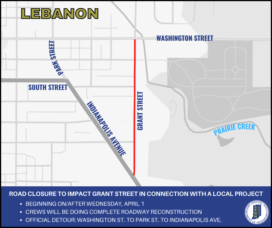 Beginning on or after Wednesday, April 1, Grant Street will close between Washington Street and Indianapolis Avenue for complete road reconstruction and widening. The closure is anticipated to last through the end of 2026 but is weather-dependent and subject to change.