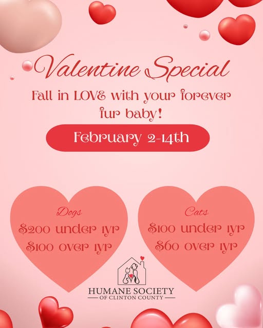 The Humane Society of Clinton County, Indiana is inviting the community to celebrate Valentine’s Day by opening their hearts and homes to animals in need during a special adoption event.