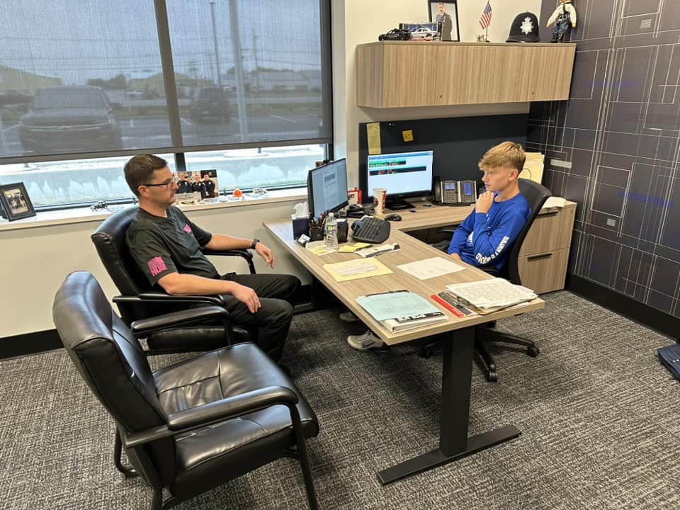 Jackson Ray & Shoemaker Jackson Ray attempts to fire Chief Scott Shoemaker as the “Chief for a minute.” – Photo courtesy of FPD.