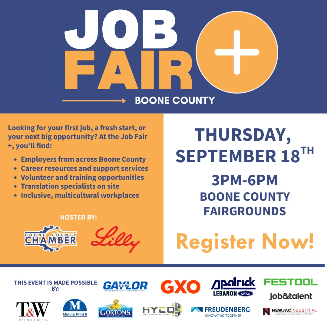 The Boone County Chamber of Commerce is proud to present Job Fair Plus presented by Lilly on Thursday, September 18, from 3:00 to 6:00 PM at the Boone County 4-H Fairgrounds – Witham Pavilion.