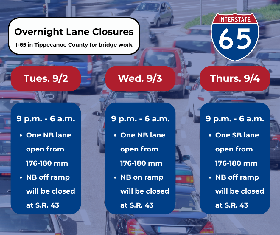 The Indiana Department of Transportation announces a series of overnight lane and ramp closures on I-65 in Tippecanoe County between mile-markers 176 and 180, located near State Road 43.