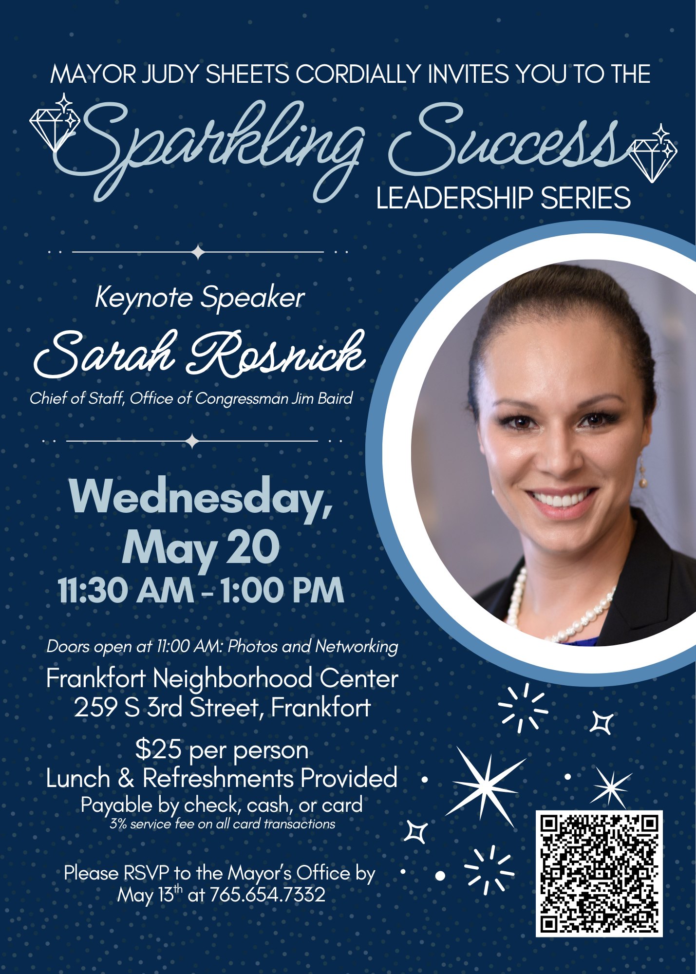 Mayor Judy Sheets has announced the next installment of the city’s Sparkling Success Leadership Series Luncheon, set to take place on Wednesday, May 20, 2026, from 11:30 a.m. to 1:00 p.m. at the Frankfort Neighborhood Center.