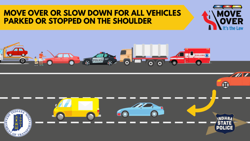 The Indiana Department of Transportation and Indiana State Police are urging drivers across Indiana to move over and slow down for emergency responders and disabled vehicles with flashing lights activated on the shoulders of highways and interstates.