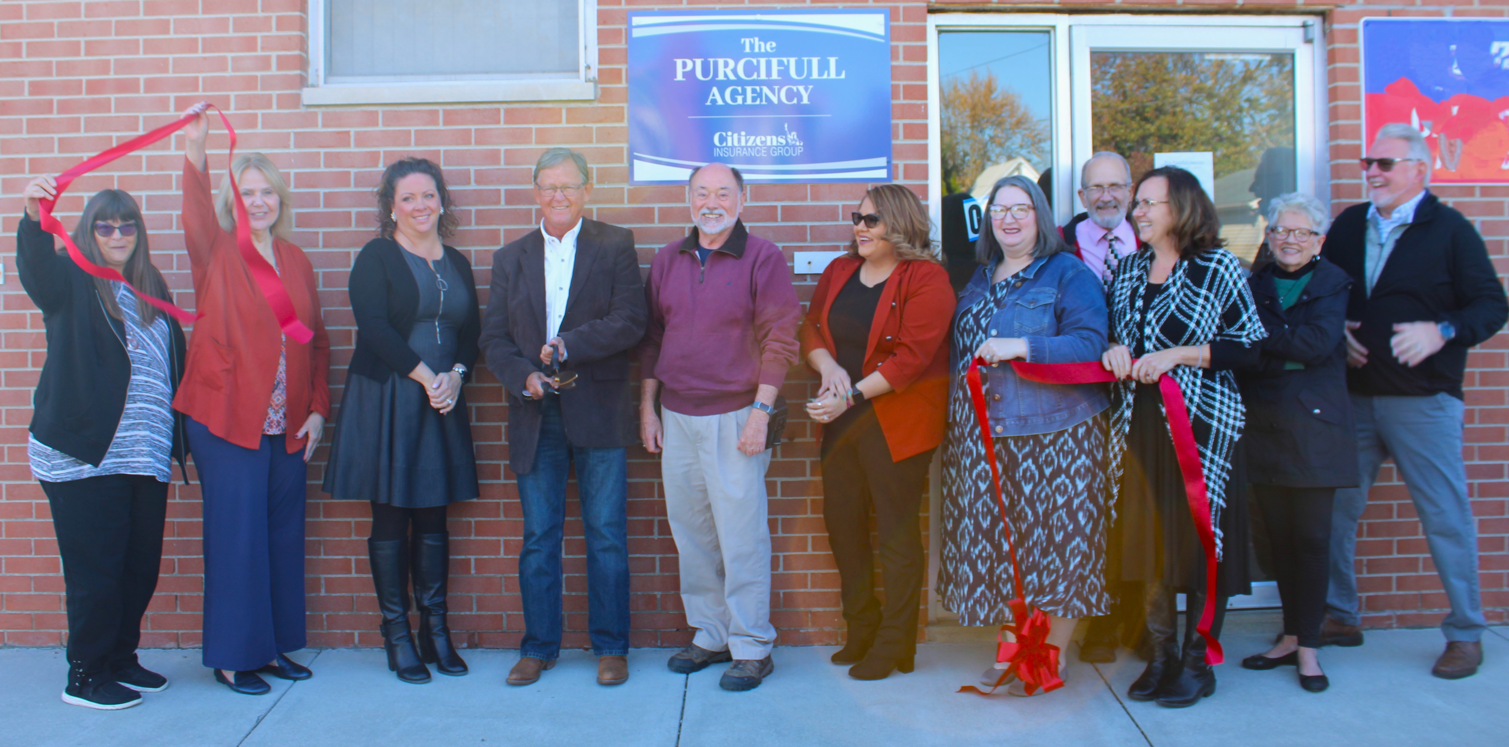 Members of the community celebrate the ribbon cutting with members of the Purcifull Agency