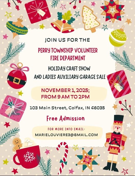 The Perry Township Volunteer Fire Department will be hosting its annual Holiday Craft Show along with the Ladies Auxiliary Garage Sale on Saturday, November 1, from 9 a.m. to 2 p.m. The event will take place at 103 Main Street, Colfax.