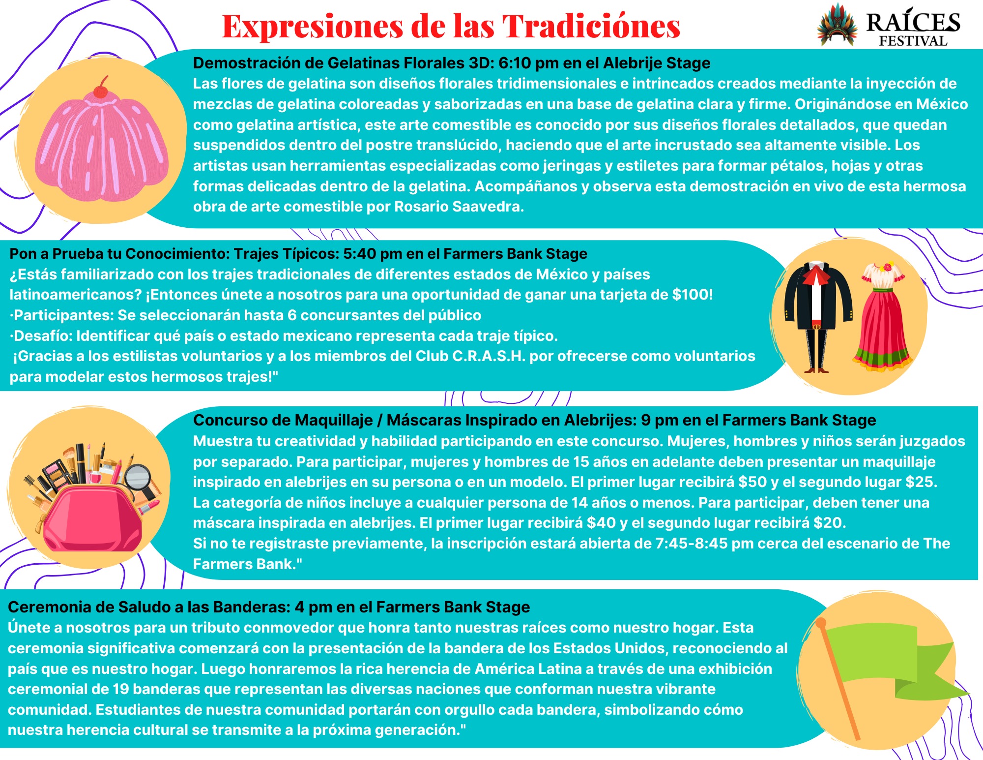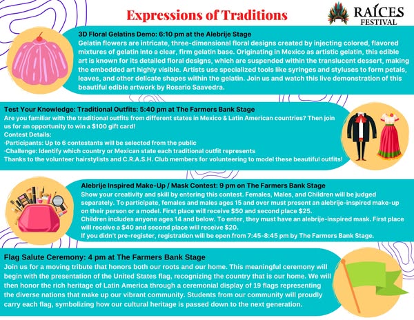 Contests, including Tamalazo, art, essay, mini model, Miss Raíces, Alebrije-inspired make-up & mask, and a pupusa-eating contest.