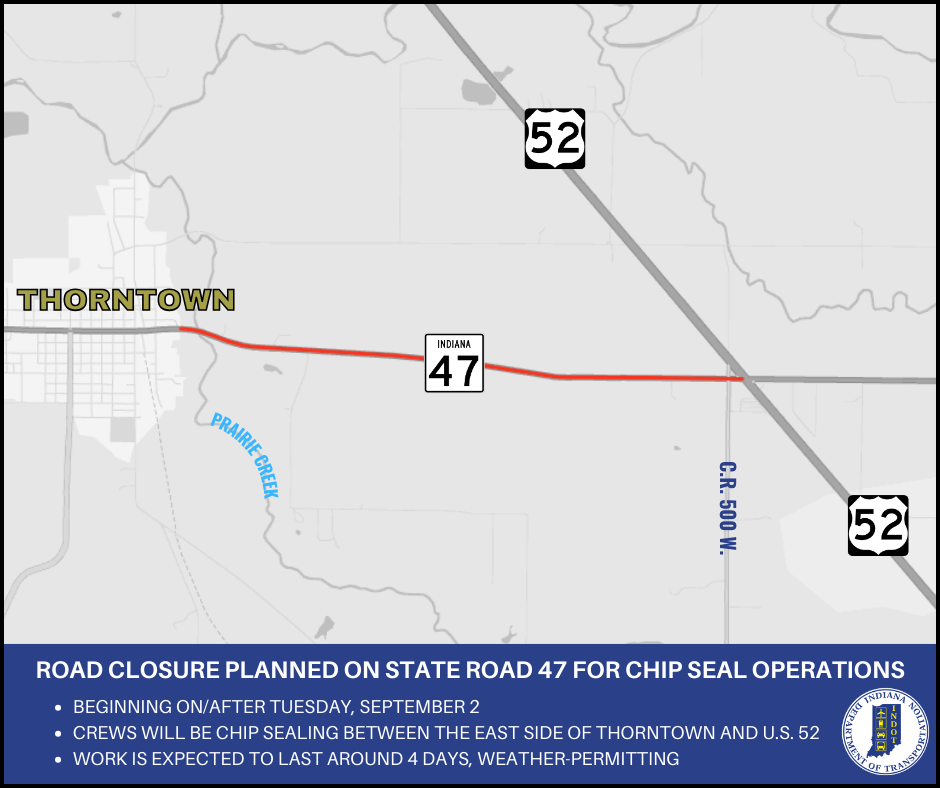 The Indiana Department of Transportation announces chip seal operations on State Road 47 between the east side of Thorntown and U.S. 52. Beginning on or after Tuesday, September 2, crews will close this section of roadway to complete a chip seal operation.