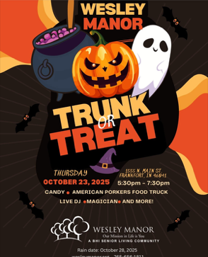 Wesley Manor Retirement Center is inviting the community to a spooktacular Trunk or Treat event on Thursday, October 23, from 5:30 to 7:30 p.m. at 1555 N. Main Street, Frankfort.